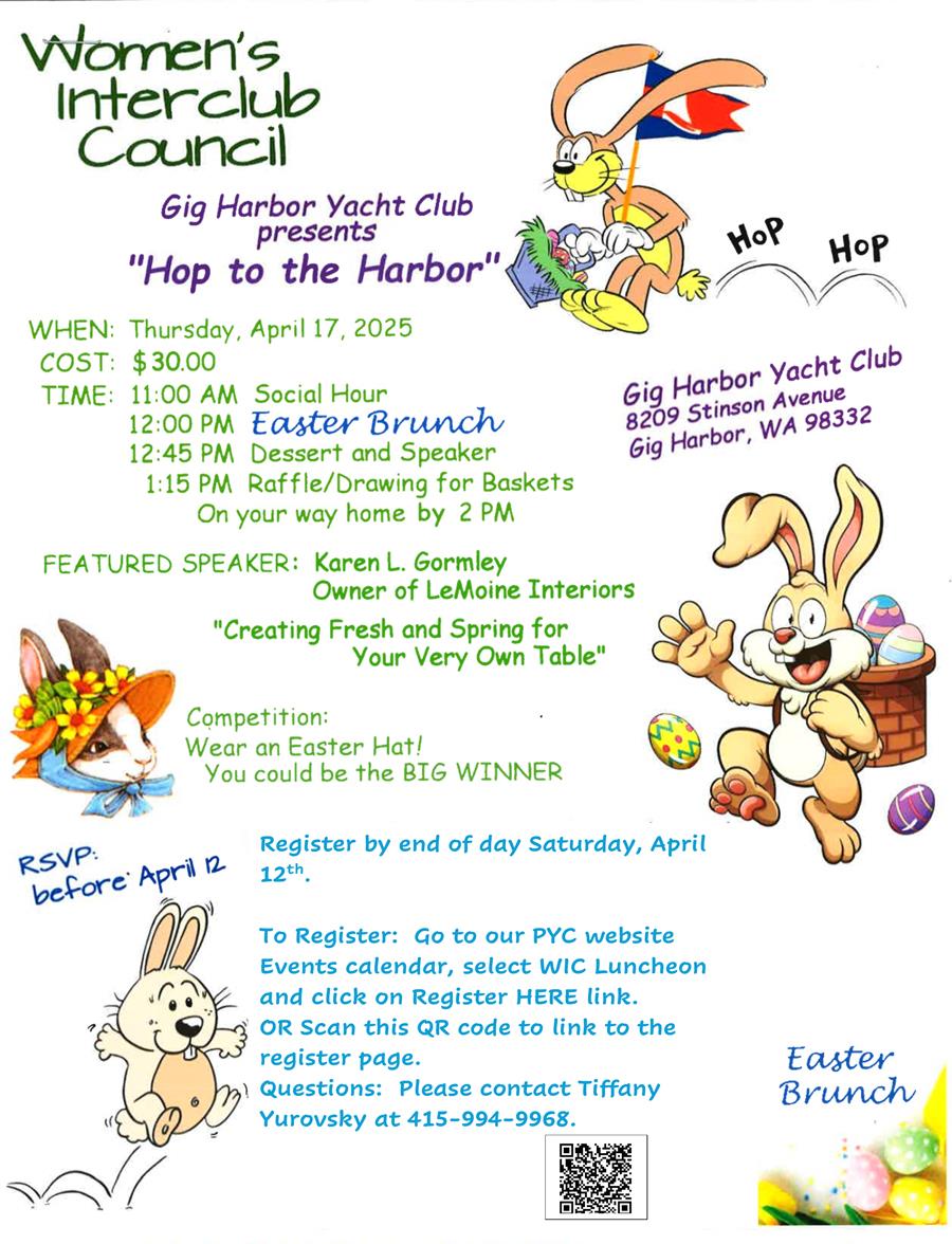 Cost: $25.00 per person Menu: Salad, Chicken Cordon Bleu, Rice Pilaf, Green Beans, Apple Blossoms About the Speaker: Richard Blumenthal is the author of several books on the history of local waterways, including How Many Islands? A History around Lake Washington. His topic will be "Renton: When Rivers Disappear". Luncheon attire of slacks or dresses. Carpools will be arranged. Registration for March is now closed. Details of the April luncheon at Gig Harbor Yacht Club will be available soon. Questions? Please contact Tiffany Yurovsky, our WIC representative. Learn more about the Women's Interclub Council (WIC) HERE |